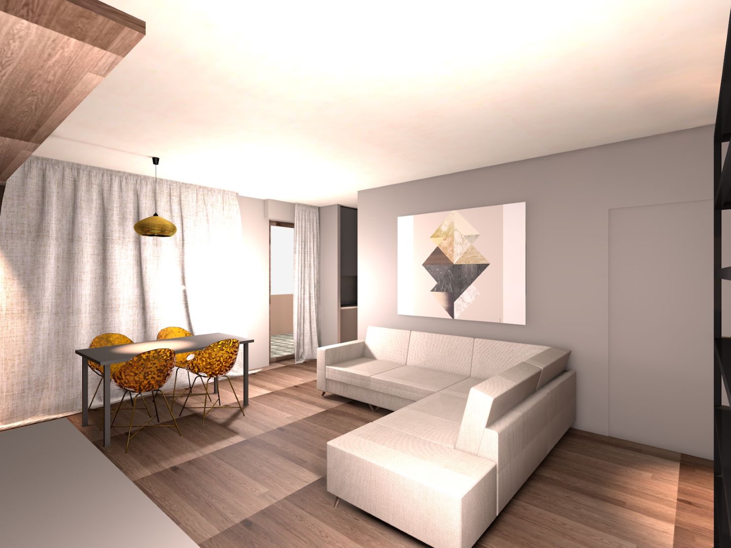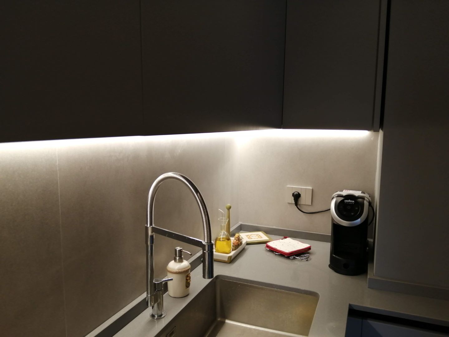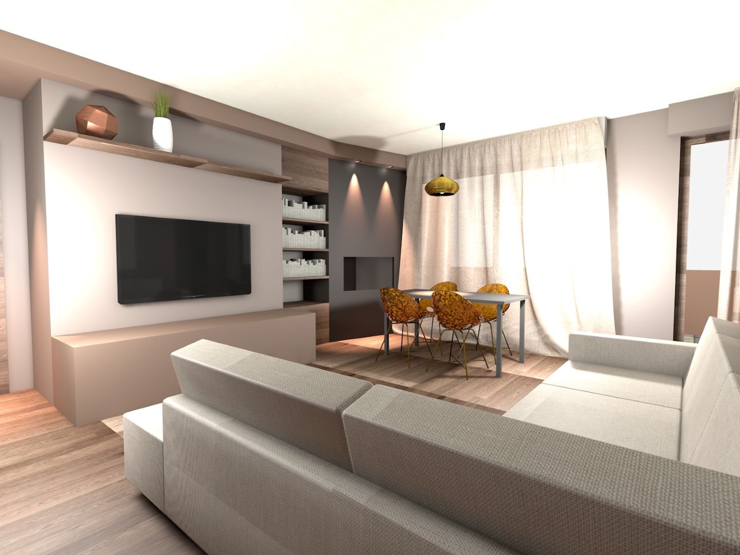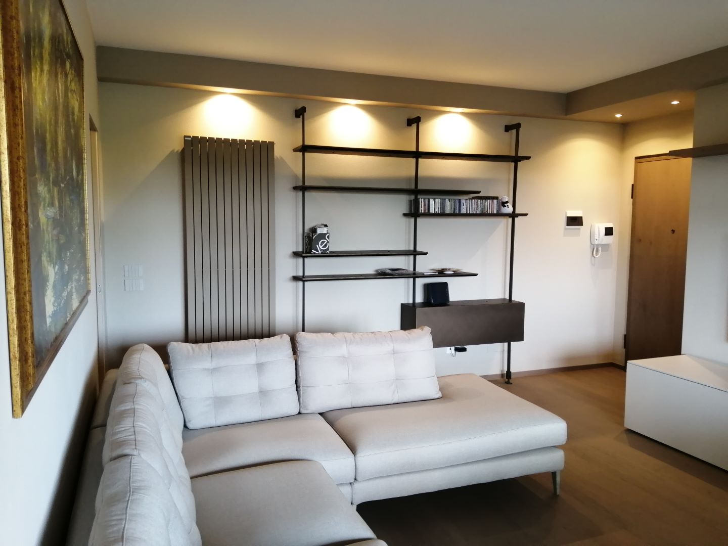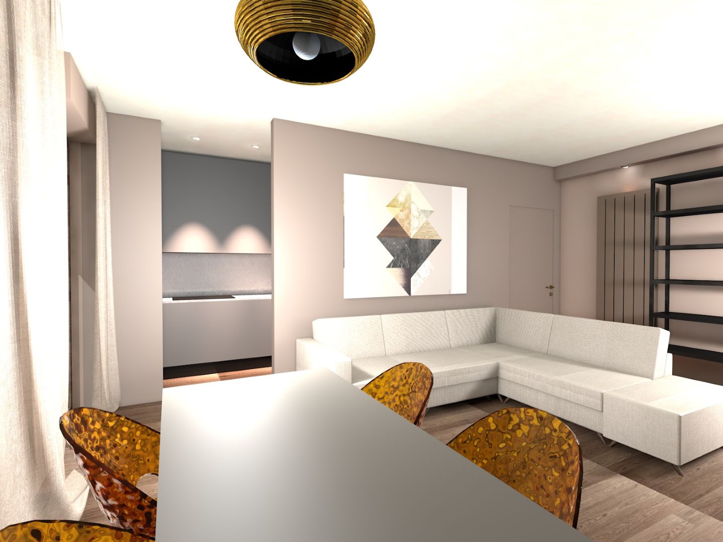 Fanno da filo conduttore di questo intervento i toni caldi del tortora e del rovere miele e l’eleganza dei metalli dorati e bronzati dei vari componenti d’arredo. Il risultato è un ambiente molto accogliente, in cui il linguaggio compositivo contemporaneo dà carattere senza eccessi. Tutti gli elementi e i dettagli dialogano per assonanza di linee e tonalità.