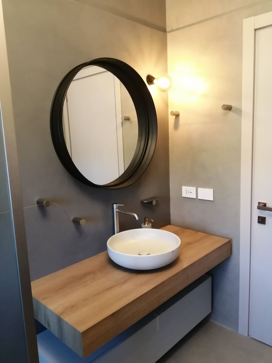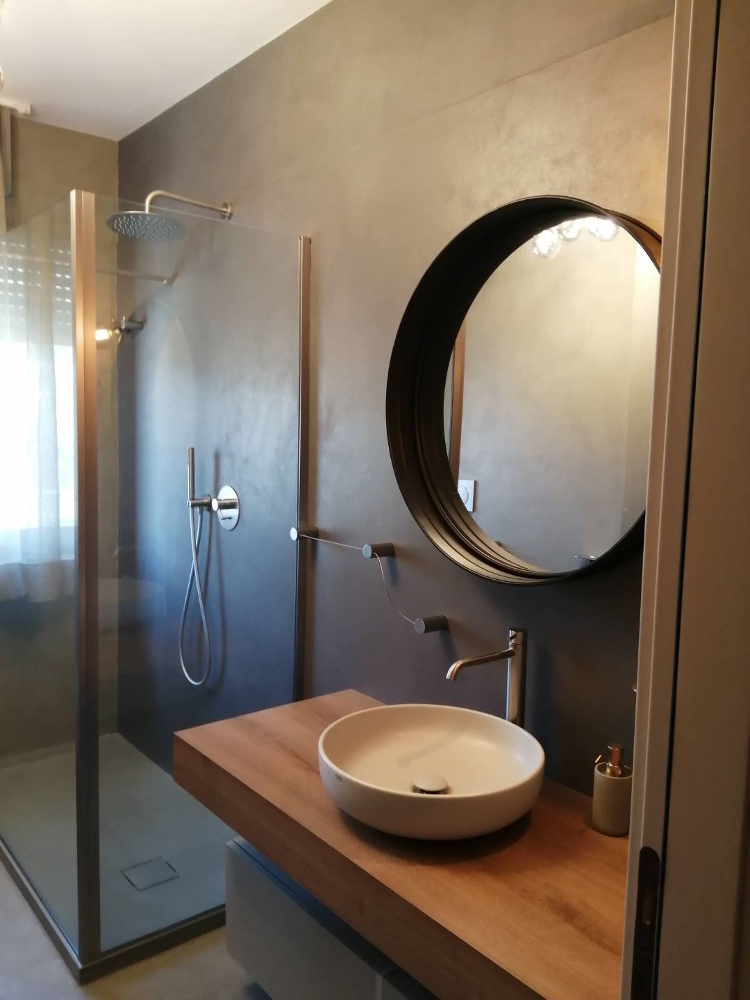 Si ritrova la stessa eleganza contemporanea nel progetto del bagno, ove la resina alle pareti fa da guscio per far risaltare gli arredi e gli accessori di design.