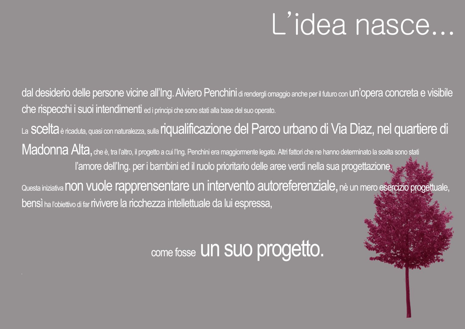 Nel 2013 è nata l’idea di proporre all’amministrazione comunale il progetto per la riqualificazione di un parco urbano, come omaggio all’Ing. Alviero Penchini che lo aveva realizzato negli anni ’80 e come offerta alla cittadinanza di spazi di socialità di elevata qualità oltre che capaci di eliminare le criticità esistenti.
